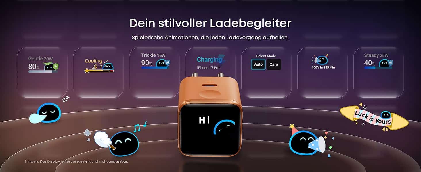 Während klassische Ladegeräte den USB-C-Anschluss auf der Front anbieten, befindet sich der Ladeport diesmal auf der Ober- beziehungsweise Unterseite. Das hat den Vorteil, dass vorne Platz für ein vollflächiges Display ist, das Informationen zum Ladestatus sowie Animationen anzeigen kann. Unter anderem lassen sich Leistungswerte in Watt ablesen. Da das Display mit einem langen Klick gedreht werden kann, ist es egal, ob der Ladeanschluss oben oder unten genutzt wird.