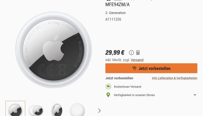 Der neu erhältliche AirTag der zweiten Generation ist erstmals unter 30 Euro erhältlich. Der Computerversand Notebooksbilliger listet die vor zwei Wochen vorgestellte neue Generation von Apples „Wo ist?“-Zubehör zum Preis von 29,99 Euro. Amazon zieht hier zumindest teilweise wie gewohnt mit, allerdings springt der Preis dort schon über den ganzen Tag hinweg zwischen 29,99 Euro…