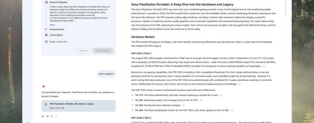 A Google Gemini report on the Sony PlayStation Portable. Yesterday, I published the latest installment of my Mac Hacks column, an exclusive perk of Club MacStories+ and Club Premier, covering how I use Google Gemini combined with read- and listen-later services to do preliminary research for projects. What started as a way to reduce distractions…