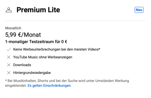 Google Videoportal YouTube erweitert sein Abo-Angebot und bringt die abgespeckte Version „Premium Lite“ nun auch offiziell nach Deutschland. Das Modell wurde bereits testweise in mehreren Ländern angeboten und soll nun in weiteren Märkten verfügbar gemacht werden. Neben der Bundesrepublik werden auch die USA, Thailand und Australien berücksichtigt. Laut YouTube richte sich das neue Abonnement an…