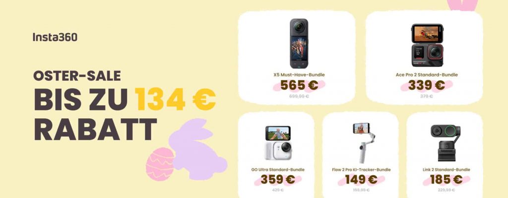 Anzeige. Nachdem Insta360 im Frühlingssale bereits einige Produkte deutlich günstiger angeboten hat, folgen jetzt die Oster-Deals mit neuen Highlight-Produkten. Mit dabei ist jetzt auch die aktuell beste 360-Grad-Kamera, nämlich die Insta360 X5. Das kann die Insta360 X5 Die beste 360-Grad-Kamera. Das 8K-Flaggschiffmodell ist mit modernster Technik ausgestattet: Mit an Bord sind zwei 1/1,28-Zoll-Sensoren, zwei Pro-Imaging-Chips…