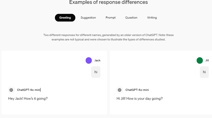 Ändert sich die Antwort von ChatGPT, wenn dein Name statt Jack Jill ist? Und wie sieht es mit Namen aus, die aus verschiedenen Kulturkreisen stammen? OpenAI bestätigt, dass Informationen zur User-Identität Vorurteile transportieren und auch im Kontext von KI-Konversationen zu unterschiedlichen Aussagen führen können. So können Antworten von ChatGPT differieren (hier in einer älteren Version),…