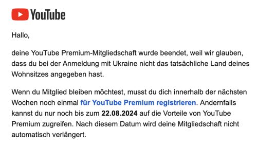 Bereits im Juni hat die Meldung die Runde gemacht, dass YouTube gegen Nutzer vorgeht, die ihre Premium-Mitgliedschaft zu günstigen Konditionen im Ausland abgeschlossen haben. Jetzt hat der zu Google gehörende Videodienst noch einmal nachgelegt und, wie es scheint, insbesondere auch in Deutschland zahlreichen Nutzern mitgeteilt, dass ihr Abonnement zum nächsten Abrechnungszeitpunkt gekündigt wird. Die E-Mails…