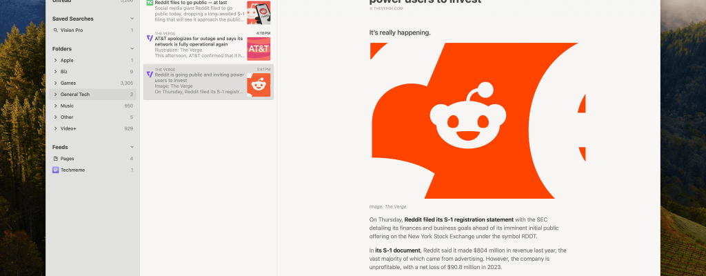 Skimming through the day’s tech headlines in Reeder. I follow about 180 RSS feeds, and I skim through all of my tech feeds every day, looking for interesting news, angles, opinions, and inspiration. A lot of what I see is repetitive, but I’ve gotten very good over the years at speed-reading snippets of stories and…